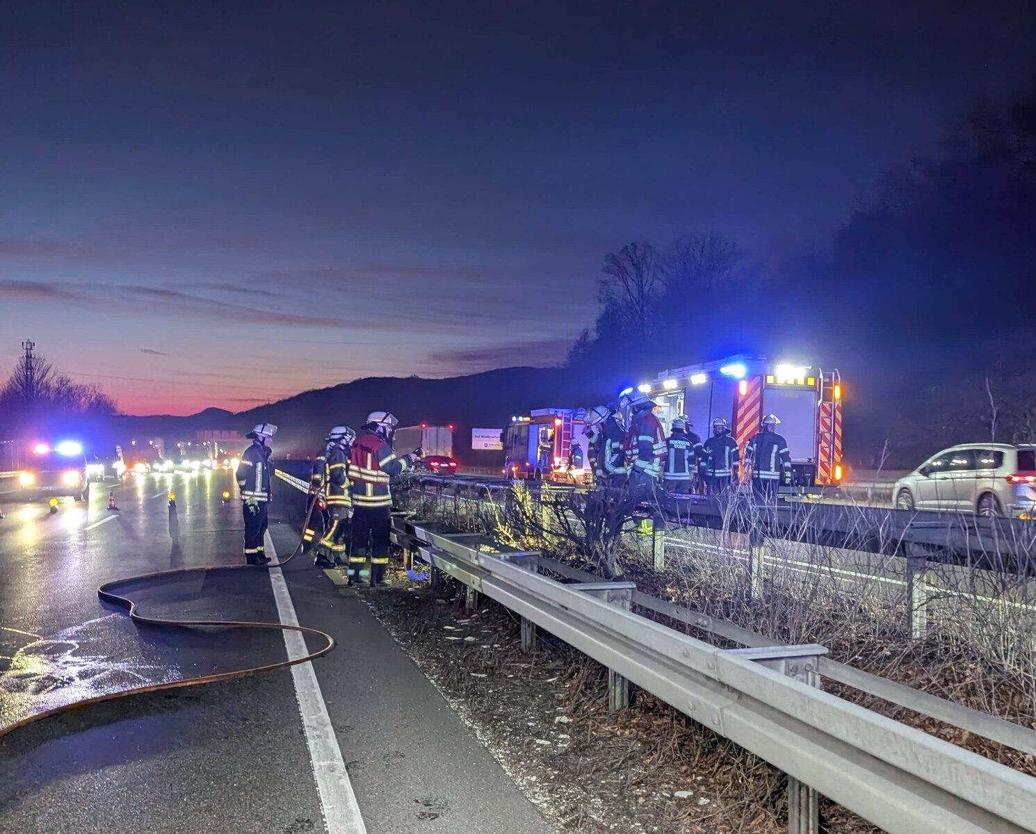 Zeitgleich wurde sowohl die Verkehrsabsicherung aufgestellt, als auch mit dem Schnellangriff die Löscharbeiten begonnen. Gerade bei der Lage auf der A2 und den schlechten Sichtverhältnissen durch die Dunkelheit war die Verkehrsabsicherung und damit die Eigensicherung besonders wichtig. Diese wurde auch schnell von der Polizei übernommen.
